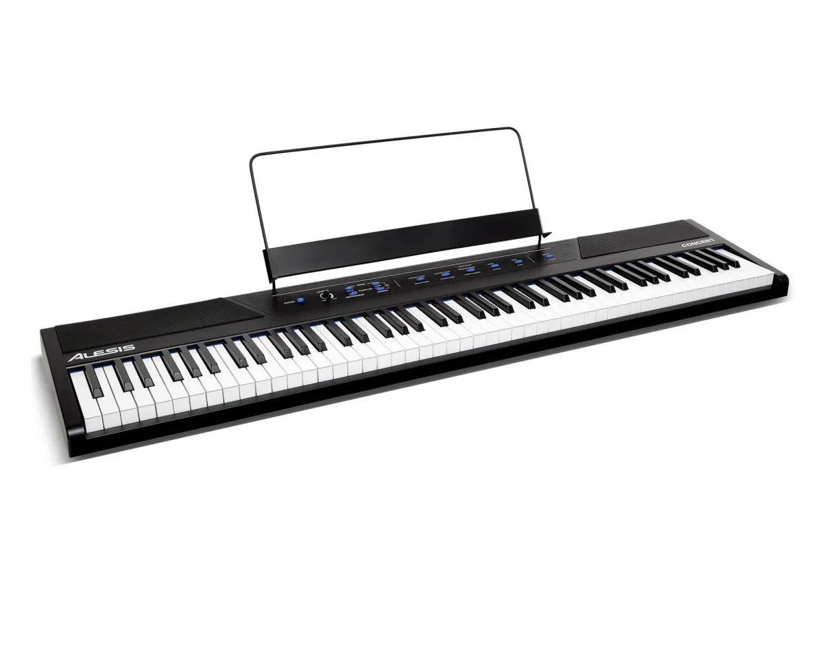 Alesis Concert är ett fullfjädrat digitalpiano med 88 halvviktade tangenter i full storlek med justerbar anslagsrespons. Konserten har 10 realistiska inbyggda röster: akustiskt piano, ljust piano, elektriskt piano, cembalo, dragorgel, kyrkorgel, synth, stråkar, bas och clavi. Anpassa rösterna genom att kombinera två valfria samtidigt i lagerläge för en fyllig, fyllig ton. De kan också tilldelas endast vänster eller höger händer i Split Mode. Du kan till och med lägga till justerbar Reverb och Chorus för att ytterligare skräddarsy ditt ljud. Med kraftfulla 20-watts inbyggda högtalare och en 128-toners maximalt polyfoni, levererar Concert ultrarealistiskt ljud med fantastisk spelupplevelse.