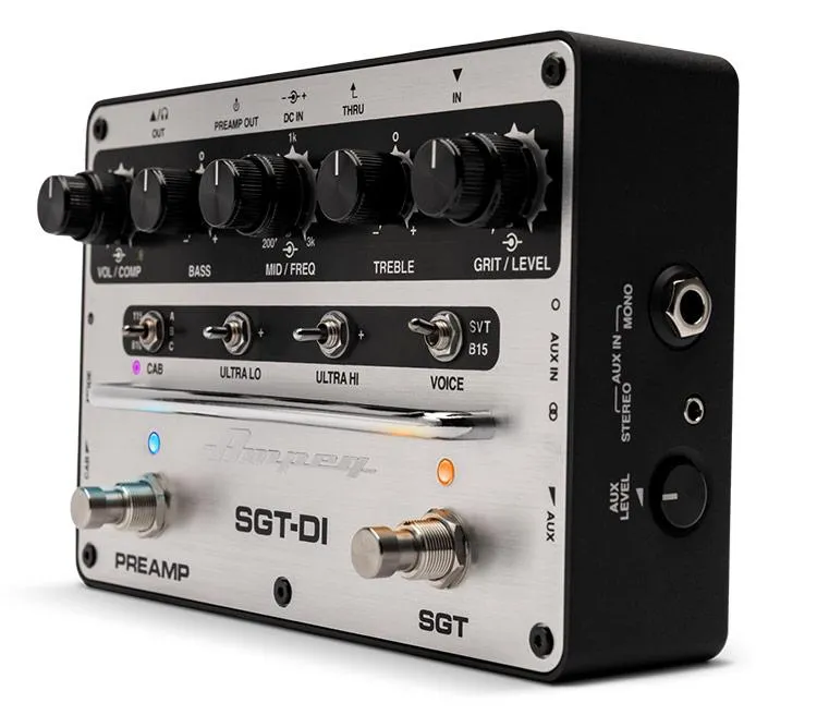 SGT-DI™-förförstärkaren och DI ger moderna basister en hel rigg i en enda stompbox. Den levererar en förbättrad Super Grit Technology™-överväxlingskrets med ikoniska Ampeg SVT®- och B15-röster, mångsidig 3-bands EQ nu med svepbar mellankrets, Ultra-Hi och 3-vägs Ultra-Lo-switchar, en variabel kompressor och en Aux / Hörlurssektion. Plus! Vi presenterar den första IR-lastaren/hyttsimulatorn från Ampeg. Välj mellan tre klassiska fabrikshytter eller upp till tre egna hytter genom att använda den kostnadsfria Ampeg IR Loader-applikationen.