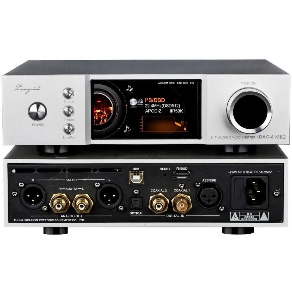Cayin IDAC-6 MK2 USB DAC är en high-end-omvandlare med rörutgångssteg och en högpresterande DAC som stöder PCM-strömmar upp till 32 bit/768 kHz och DSD 512. Den erbjuder en I2S HDMI-anslutning samt en switch mellan rör- och transistorutgång så att du kan färga ljudet enligt dina önskemål.