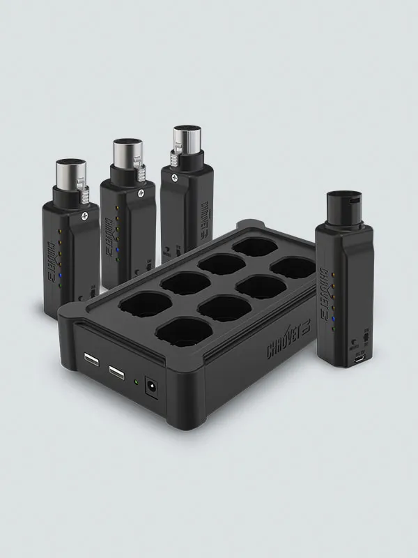 Chauvet DJ D-Fi XLR Pack är ett komplett kit för en trådlös DMX-länk. Systemet består av en sändare, tre mottagare och en laddstation.