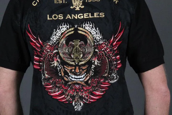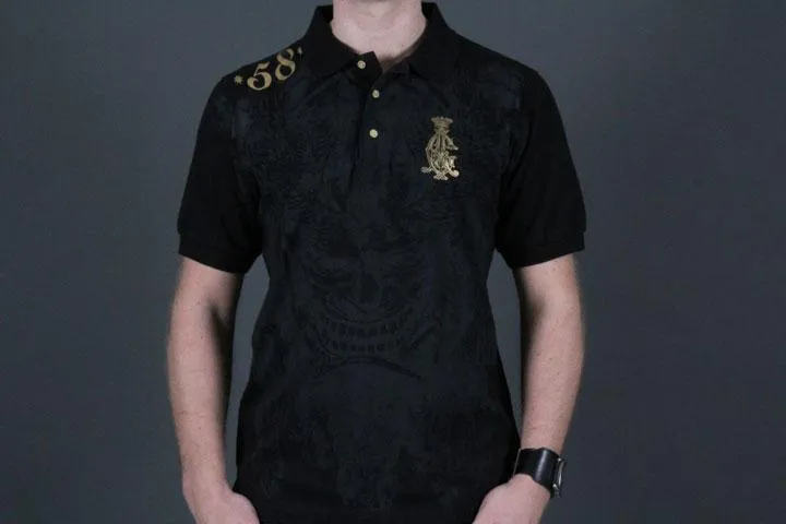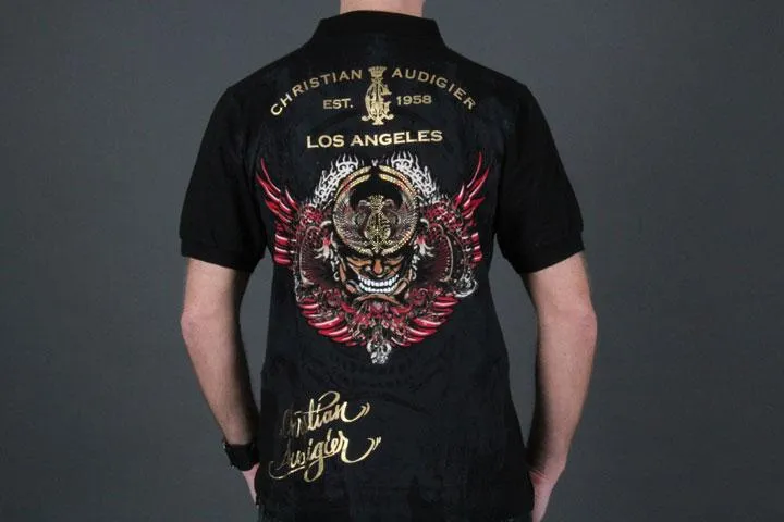 Polo piqué från Christian Audigier med häftigt tryck. 100% bomull. Herr, svart, small.