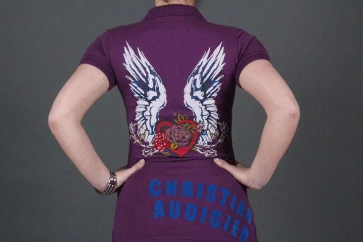 Lång polotröja för damer, Figurnära, Stretchigt material, 95% bomull 5% spandex, Print med sammets- och kristalldetaljer, Normal storlek. Dam, lila, small.