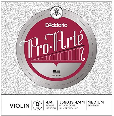 Pro-Arte Series Violin D String 4/4 Size Medium Silver. Pro-Arte synthetic core violin D strings have a warm, mellow tone. The Pro-Arte strings are less sensitive to humidity and temperature changes, and break in quickly. These strings are manufactured at a lower tension in order to maximize bow response, tonal blend and playability. Pro-Arte violin strings are the perfect choice for players seeking a warm, dark tone. All D'Addario strings are designed, engineered and manufactured in the USA to the most stringent quality controls in the industry.