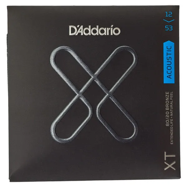 Daddario XTABR1253 XT Acoustic 80/20 Brons, Set med strängar för västerländsk gitarr; Styrka: Lätt spänning; Material (lindningstråd): Brons; Lindningstyp: Round Wound; Mikroskopiskt tunn, fuktavvisande beläggning på alla 6 strängarna påverkar inte tonen eller känslan; Tillverkade av "HIGH CARBON NEW YORK STEEL" och i kombination med "FUSION TWIST" för fastsättning av kuländarna, ger strängarna maximal draghållfasthet och avstämningsstabilitet: Mätare: 0,012; .016; .024w; 032w; .042w; .053w