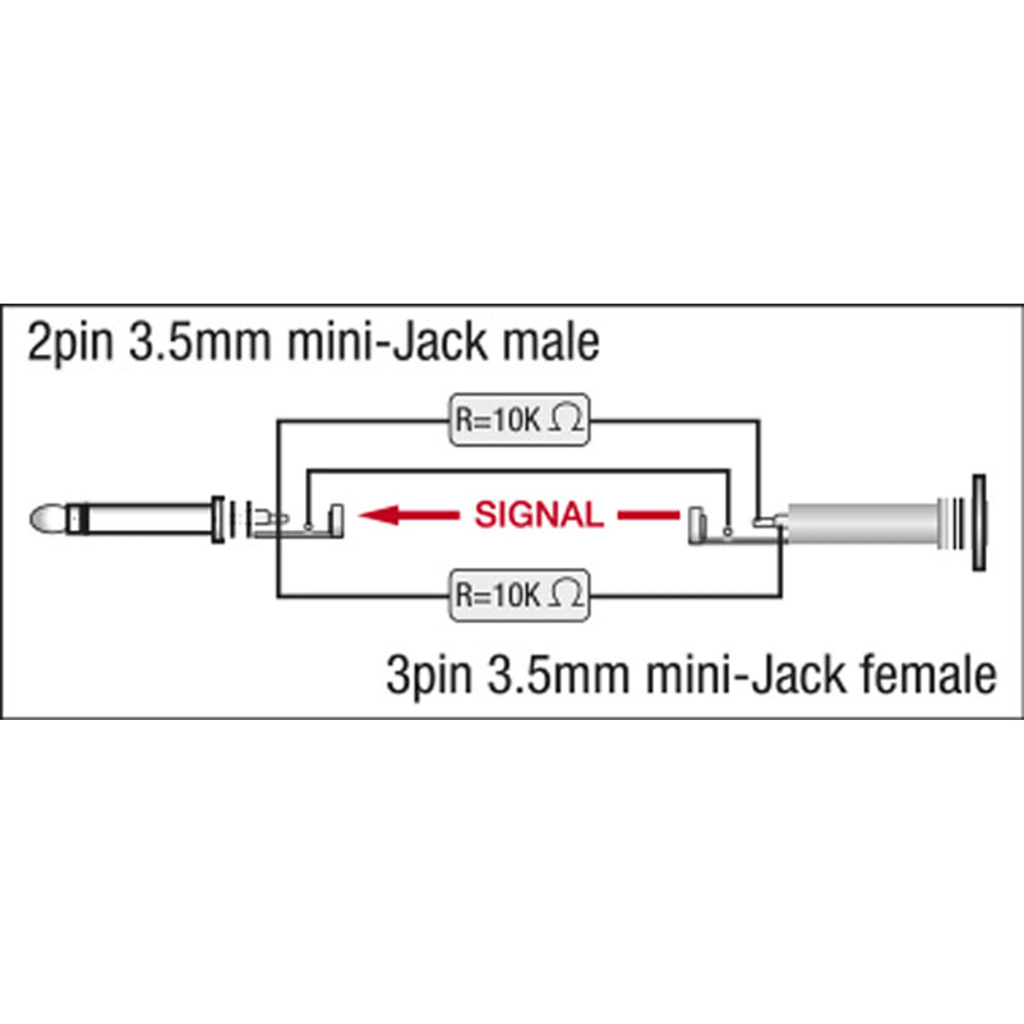 Adapter, 3.5mm hane mono TS till 3.5mm hona stereo, 2 x 10 kOhm motstånd, guldpläterad. Säljs per styck.