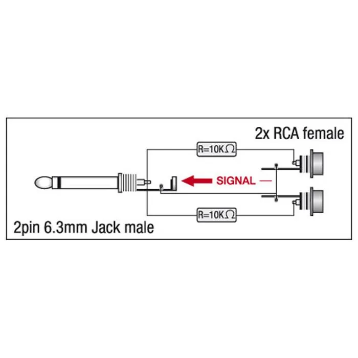 Adapter, 6.3mm hane mono till 2 x RCA honor med 2 x 10 kilo-Ohm motstånd. Säljs per styck.
