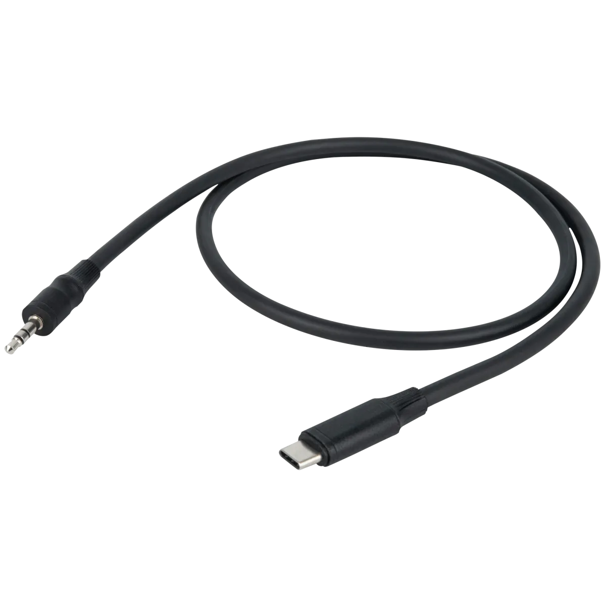 USB-C till stereominikontakt-kabel är en svart ljudkabel med en förnicklad, hane minikontakt för att ansluta valfri USB-C-enhet till en minikontaktingång. Den är mycket flexibel, vilket gör den bekväm och enkel att använda.