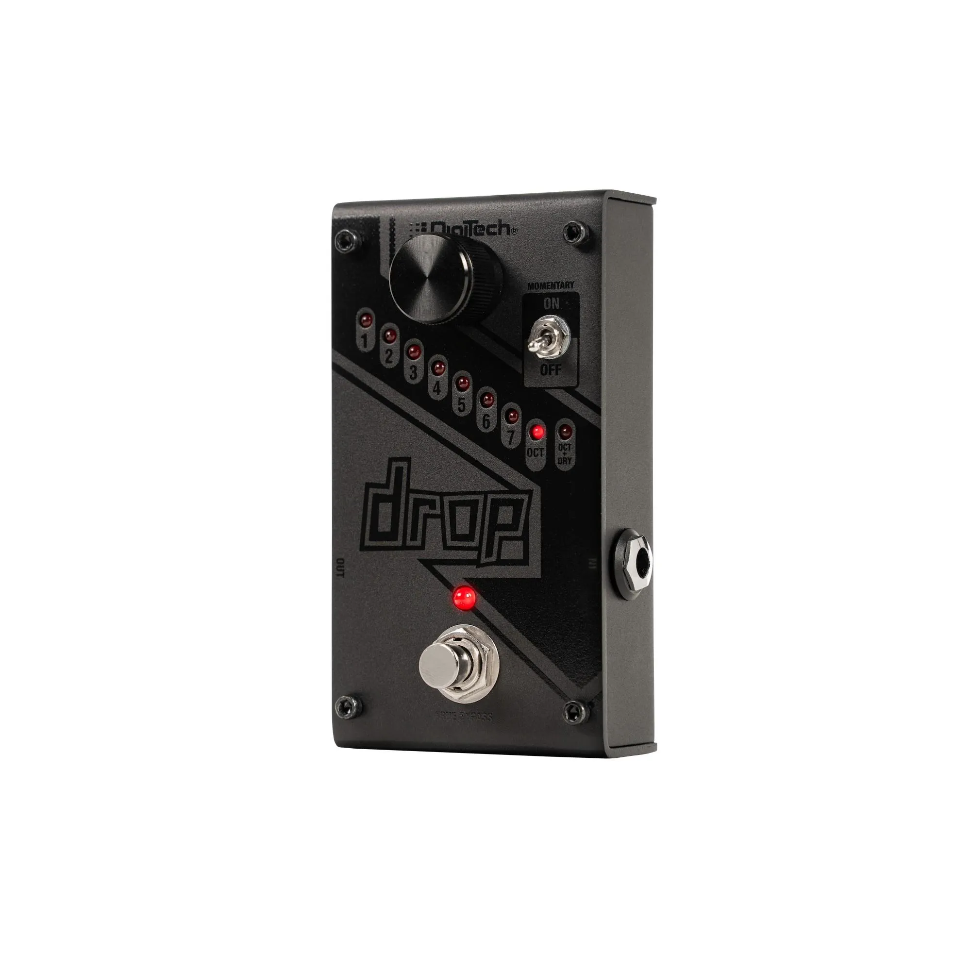 DigiTech® Drop är en dedikerad polyfonisk drop tune-pedal som låter dig sänka stämningen från en halvton till en hel oktav. Få nedstämd klang utan att behöva byta gitarr! Drop har också en momentant/låsande omkopplare. Med omkopplaren inställd på momentant kan du förvandla Drop till en riktig performance-pedal. Snabba triller och berg-och-dalbana-liknande tonhöjdsfall ligger inom räckhåll.