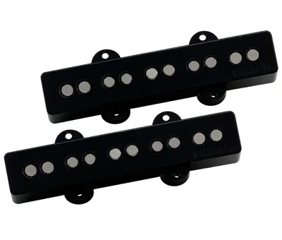 "Ultra Jazz 5™ Pair DP549BK. The Ultra Jazz 5™ has many of the same qualities as the 4-string Ultra Jazz™, but it’s been specifically designed to meet the demands of 5-string basses. By means of a unique application of Virtual Vintage® technology, the Ultra Jazz 5™ both cancels hum and produces balanced power and frequency response across all five strings. Although designed for passive operation, the Ultra Jazz 5™ also performs excellently with many active onboard preamps. Recommended For Neck and bridge position. Important Note: The cover dimensions of the Ultra Jazz 5™ are not the same as 5-string Fender Jazz Bass®. The Ultra Jazz 5™ therefore cannot be installed as direct replacements on these basses without modification. Tech Talk The appearance of the Ultra Jazz 5™ is traditional, but the wide dynamic range and frequency response of the hybrid magnetic structure allows both vintage and modern sounds. Hum-cancellation is achieved by using Virtual Vintage® technology to suppress 60-cycle noise, with one coil sensing the “B”, “E”, and “A” strings, and the other coil sensing the “D” and “G” strings. While the basic sound of the pickup is similar to the 4-string Ultra Jazz™, it's been adjusted to keep the tonality and response as consistent as possible from the “B” string to the “G” string. Particular care was taken to keep the low “B” string big-sounding without becoming muddy. Specs. DP549BK: Finish: Black. Wiring: 2 Conductor. Magnet: Alnico 5 & Ceramic. Output mV: 230. DC Resistance: 16.6 Kohm & 16.9 Kohm. Year of Introduction: 2001. Patent: 5,908,998."
