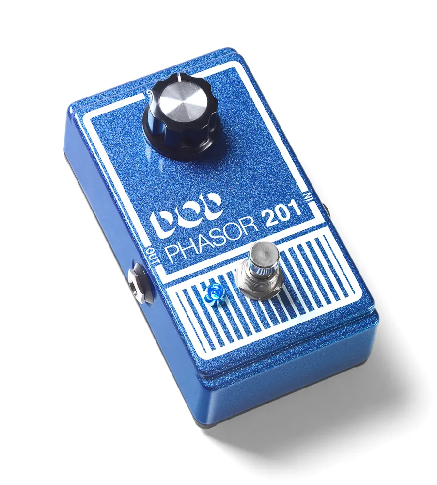 The DOD Phasor 201 brings back the classic analog phaser effect withover 40 years of history and experience behind it. The 2013 version oft he Phasor 201 is better than ever before with true bypass, a crisp blue LED indicator, and modern 9V DC power supply input. Redesigned with a lighter aluminum chassis, sleek blue metallic flake and flat black matte bottom paint job, the 2013 DOD Phasor 201 pedal provides beautiful swirly warm phase effects.
