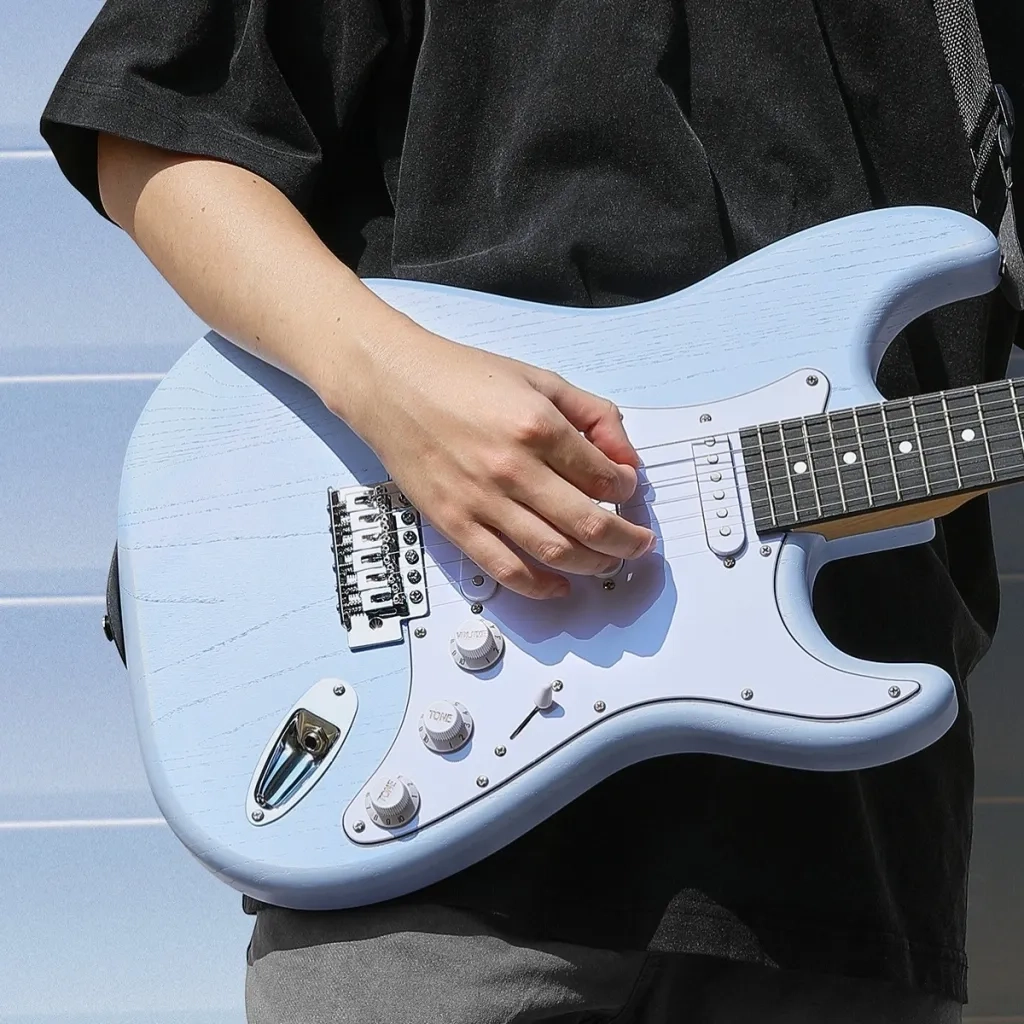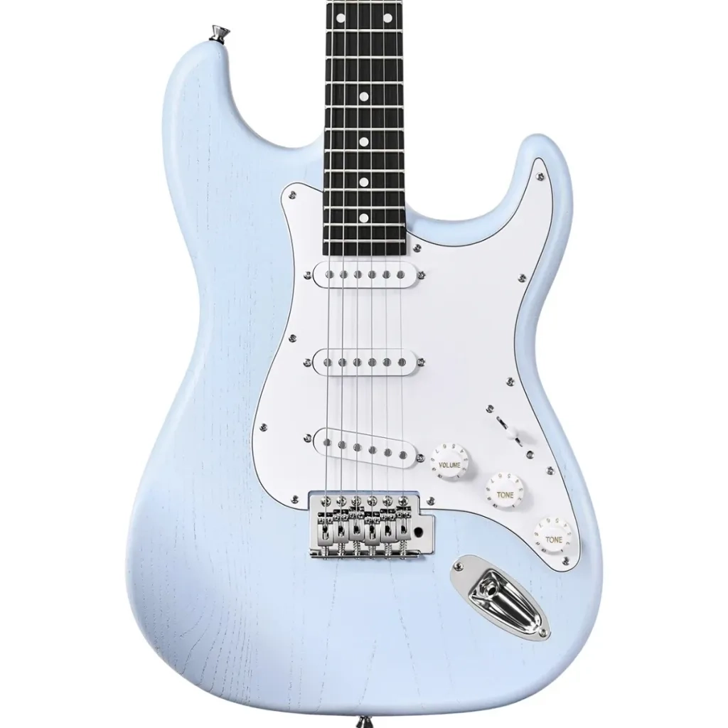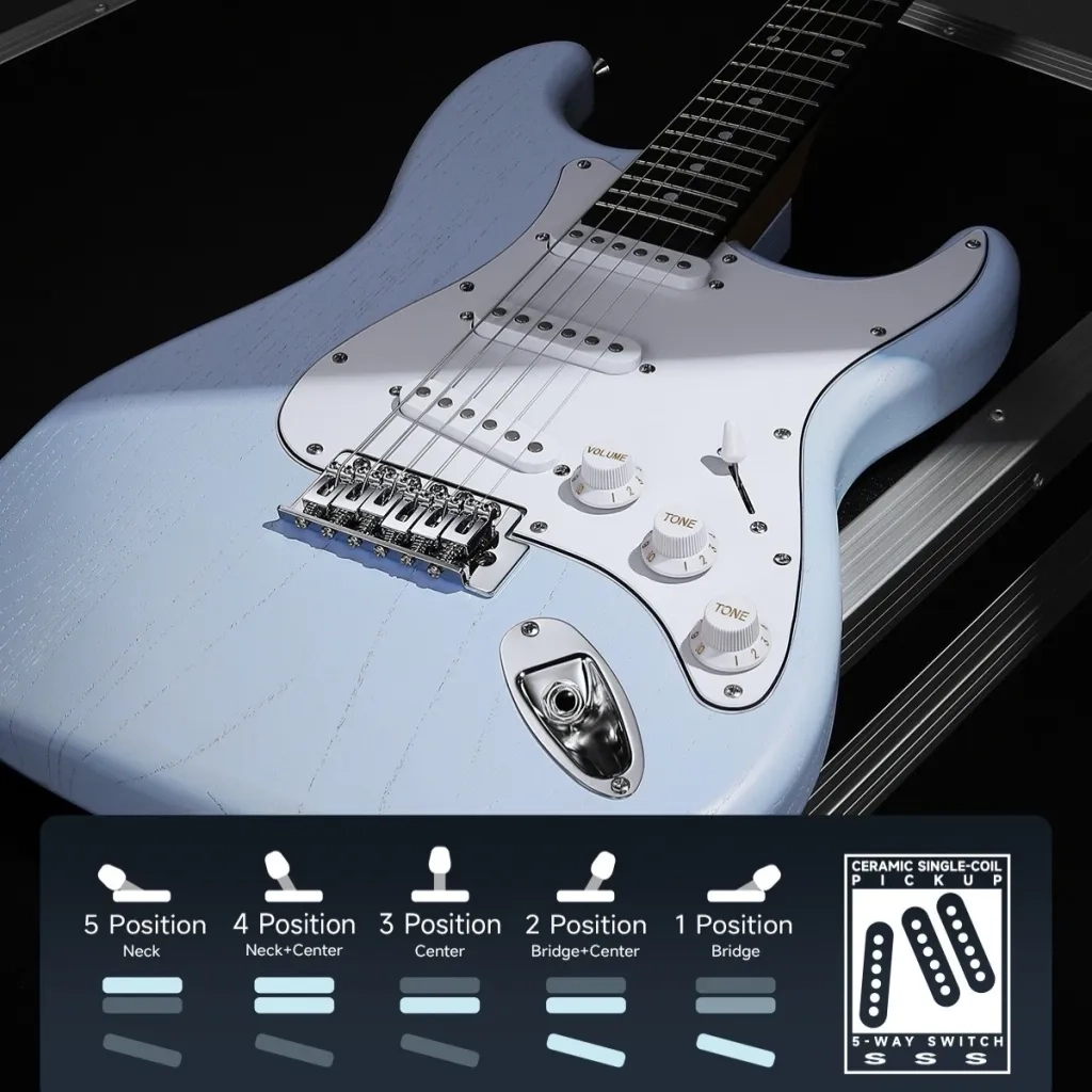Gitarren är utrustad med tre keramiska single-coil-pickuper i SSS-konfiguration och en 5-vägs pickup-väljare. Ger ett brett ljudspektrum för blues, rock, funk och country. Kontroller för volym och två tonkontroller möjliggör ljudanpassning.