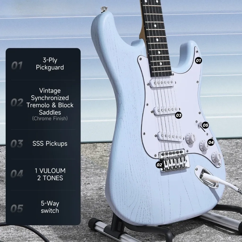 Kroppen av askträ med satin yta ger resonans och stabilitet. Den klassiska chromade tremolo-stallet möjliggör vibratoeffekter och bidrar till stabil stämning. Nickelpläterade stålsträngar i storlek .009–.042 är lättspelade och ger klart ljud.