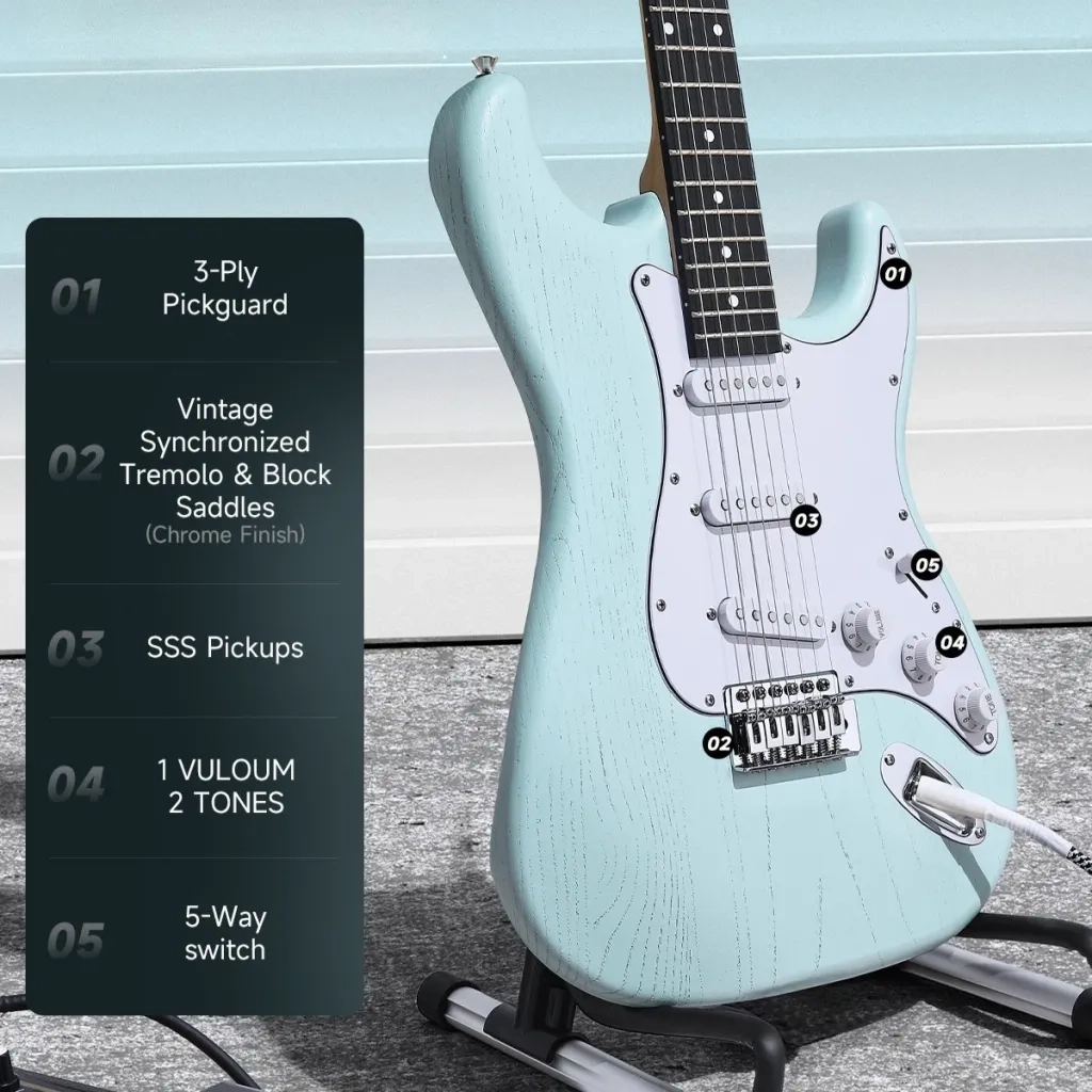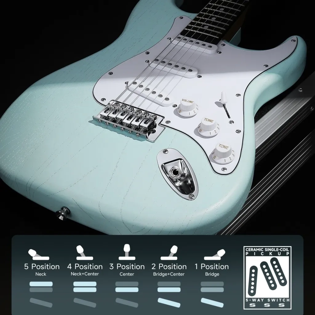 Gitarren är utrustad med tre keramiska single-coil-pickuper i SSS-konfiguration och en 5-vägs pickup-väljare. Ger ett brett ljudspektrum för blues, rock, funk och country. Kontroller för volym och två tonkontroller möjliggör ljudanpassning.