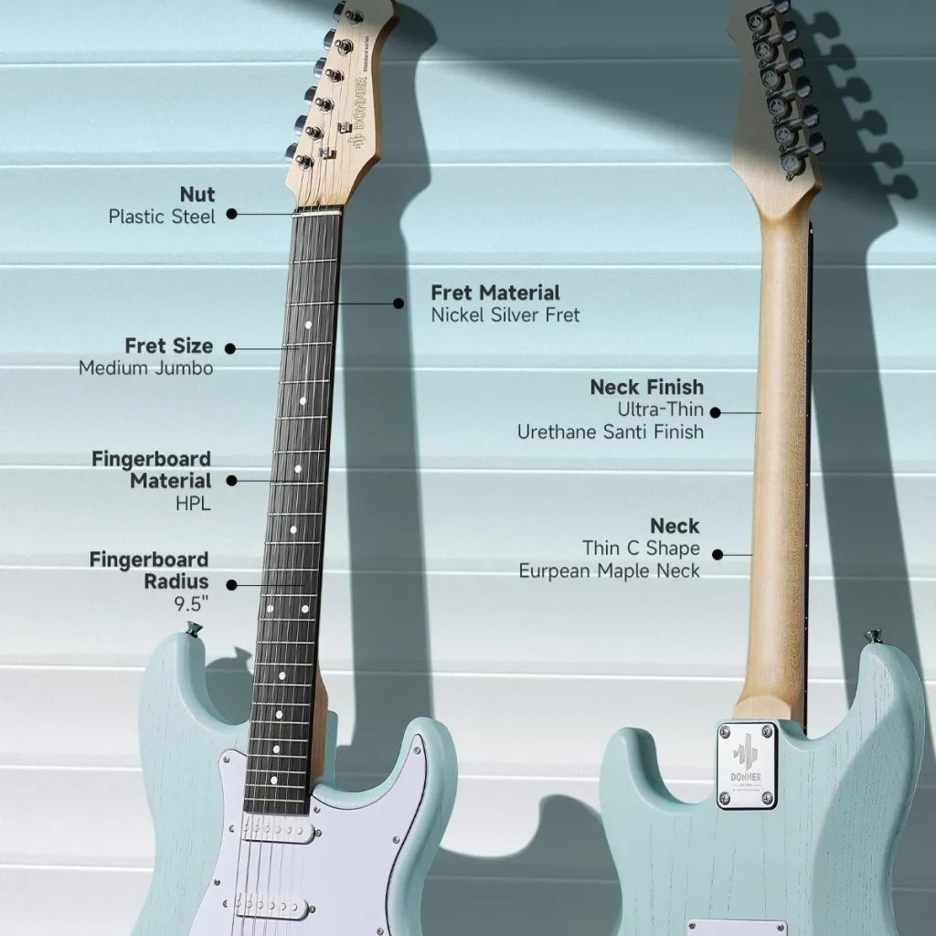 Utrustad med en slimmad C-formad lönnhals med satinfinish för behaglig spelkänsla. Skallängden är 25,5" och greppbrädan har 22 band, vilket gör det enkelt att röra sig över halsen även för nybörjare.