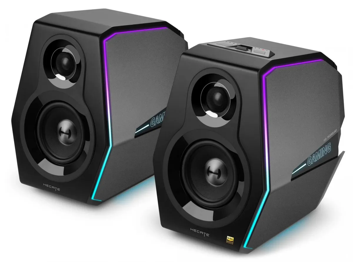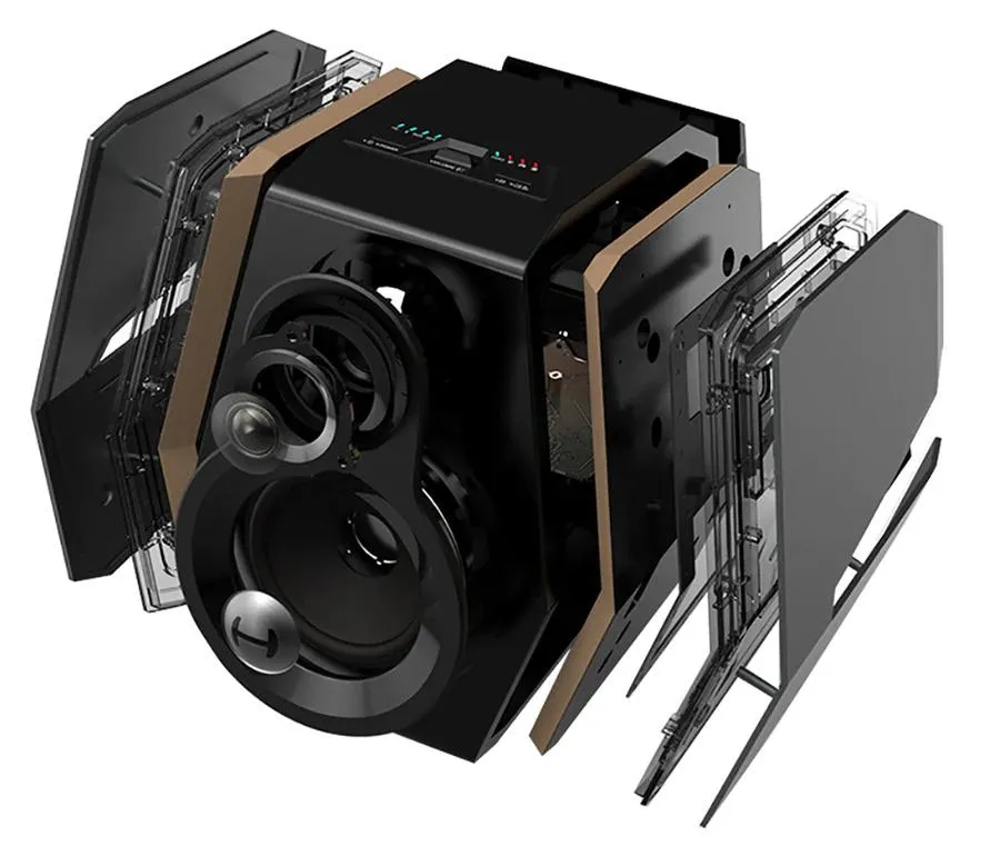 Genom att smälta samman högtalarskåpet i trä med sidopanelerna i aluminium, inkorporerade designarna också akustisk flaggskeppskonfiguration och RGB-ljusteknik för att skapa ett unikt utseende. Fyra 360° surroundljusremsor är inbäddade i kroppen på dessa spelhögtalare och har 11 omgivande ljuslägen som du kan välja mellan.