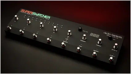 - Tryckfotknapp ställer in BPM. Super Switcher kan konfigureras för att skicka/ta emot MIDI-klocka och skicka tappsignaler till utgången. BPM kan vara globalt eller per förinställning.