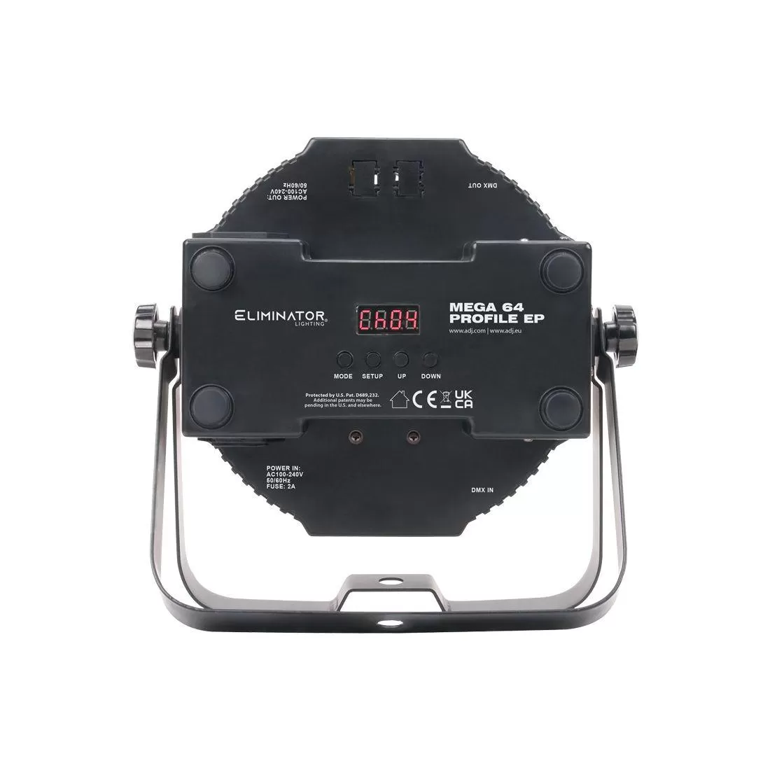 Eliminator Lighting Mega 64 Profile EP är en kompakt LED-tvättarmatur med låg profil designad för uplighting, scenbelysning och väggtvätt, och kommer att ge färg och spänning till mindre evenemang eller små scenframträdanden. Mega 64 Profile EP drivs av tolv ljusstarka 4-Watt Quad (RGB+UV 4-i-1) LED och erbjuder en unik, mer levande färgpalett med UV-LED än traditionella RGB-armaturer.