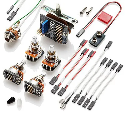 Alla lödfria komponenter för installation i ett paket! Detta kit innehåller allt som behövs för installation i en konfiguration med 3 pickuper med potentiometrar i standardstorlek (Strat). Detta kit är för aktiva pickuper.