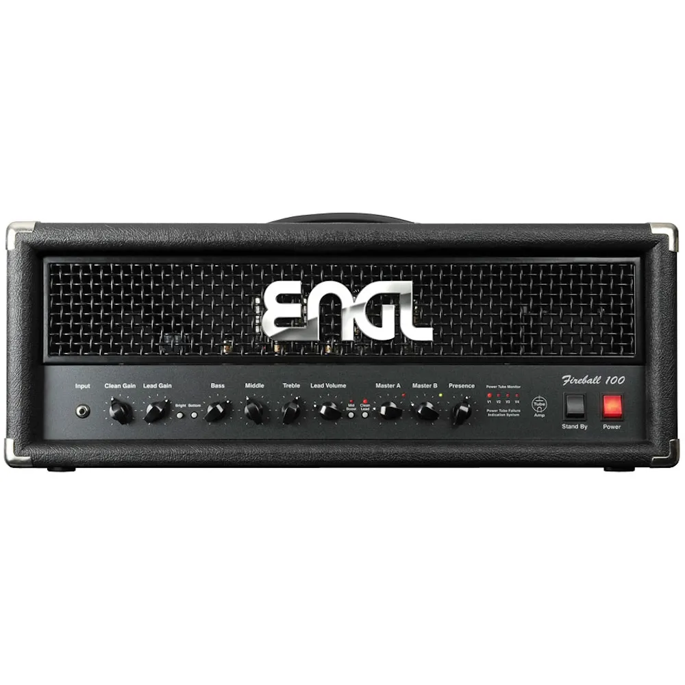 The Engl Fireball 100 guitar amp head offers all essential sound features in addition to a practical, clear layout for all players who appreciate straightforward structures. In its cool "black magic" optical appearance the amplifier head delivers a mighty bottom end punch well-suited for playing power chords and solos with precise accentuation, courtesy of its powerful 6L6GC 100-Watt power amp. Sparkling clean sounds and every imaginable nuance between Clean and Hi Gain Lead tones belong to the repertoire of the Engl Fireball 100 amp. Other trademark features include two master volume controls A and B, electronic power amp monitoring, and a variable / switchable FX Loop. Additionally, the sound shaping features Bottom and Mid Boost letting you reinforce this particular pressure in low-end and the low-mid frequency range, thus expanding the Engl amps' tonal spectrum. It also has an adjustable noise gate for the Lead channel.