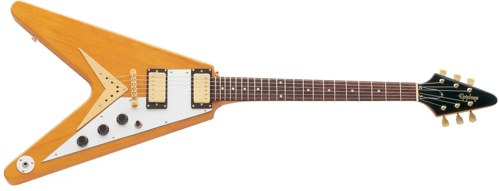Tillverkad i samarbete med Gibson™ Custom Shop, 1958 Korina Flying V™ är Epiphones imponerande återskapande av en av de mest kända och värdefulla vintagegitarrerna som någonsin gjorts. Den ger autentiska Flying V-detaljer från 1958 till gitarrister överallt till ett banbrytande pris. Liksom de ultrasällsynta originalmodellerna från 1958, har den en solid Korina-kropp och en Korina-hals med en tapp med lång hals och en 1958 års Flying V-halsprofil. Den är också utrustad med en indisk lagerbräda och guldbeslag. Elektroniken är också förstklassig, med Gibson Burstbucker™ 2- och Burstbucker 3-pickuper kopplade till individuella volymkontroller och en huvudtonkontroll med CTS®-krukor och en Mallory™-kondensator, tillsammans med en Switchcraft® 3-vägs pickupväljare och 1 /4” utgångsjack. En Epiphone x Gibson Custom-logotyp på baksidan av headstocken visas också stolt, och ett hardshell-fodral ingår också.