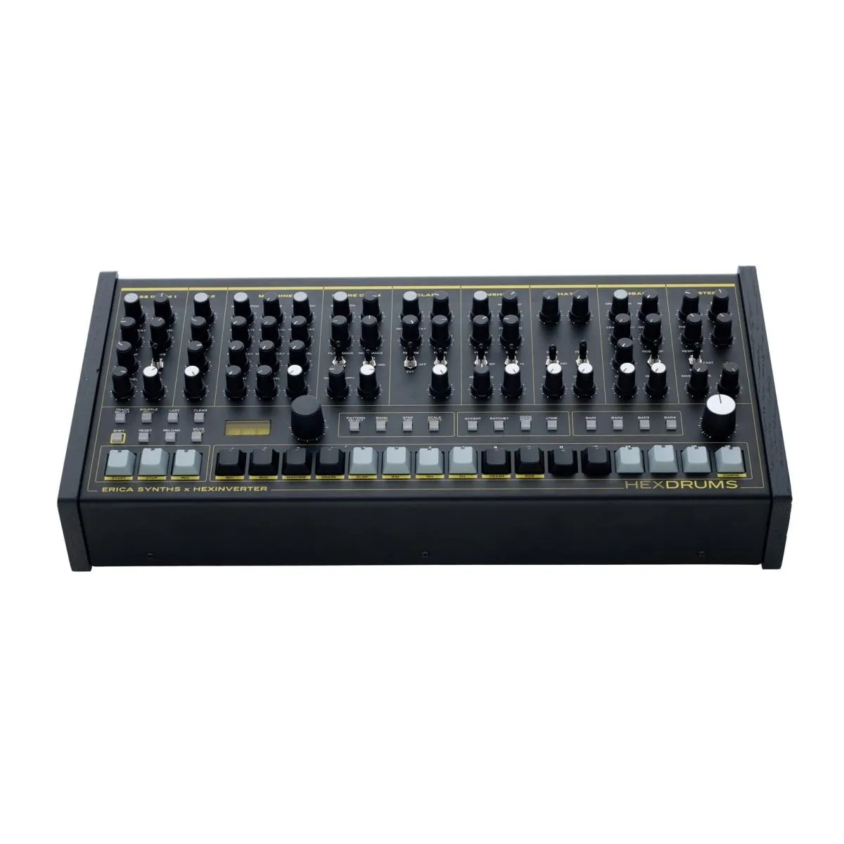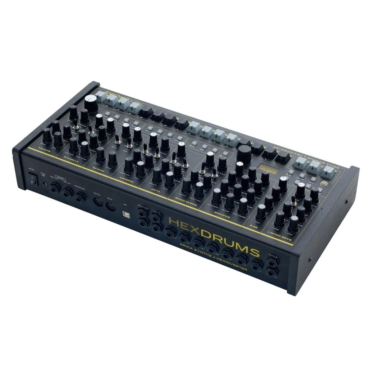 Den industriella magin från Erica Synths technovapen, sammansmält med DNA:t från Hexinverters mutantkretsar, väcks till liv som HexDrums – en analog trummaskin skapad med stor respekt för traditionella designprinciper, men med innovativa förbättringar och kombinerad expertis från båda tillverkarna.