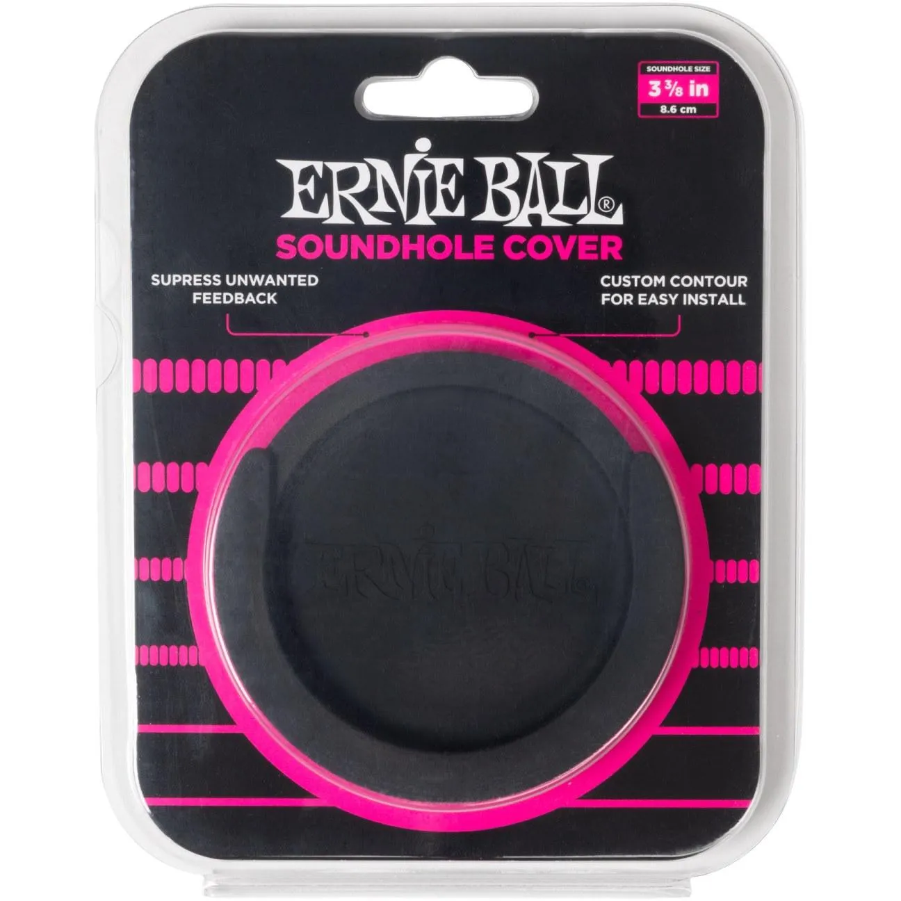 Ernie Ball 9630 Soundhole Cover är ett lock designat för att täcka ljudhålet på din akustiska gitarr. På så sätt reduceras risken för rundgång när du spelar med din gitarr inkopplad till en förstärkare eller PA. Locket är framtaget för att passa mindre ljudhål (8,5 cm) och det flexibla gummimaterialet gör att det är enkelt att sätta dit det utan att riskera skador på instrumentet. Har du problem med rundgång eller är du trött på att tappa plektrum inuti gitarren så är detta lösningen för dig.