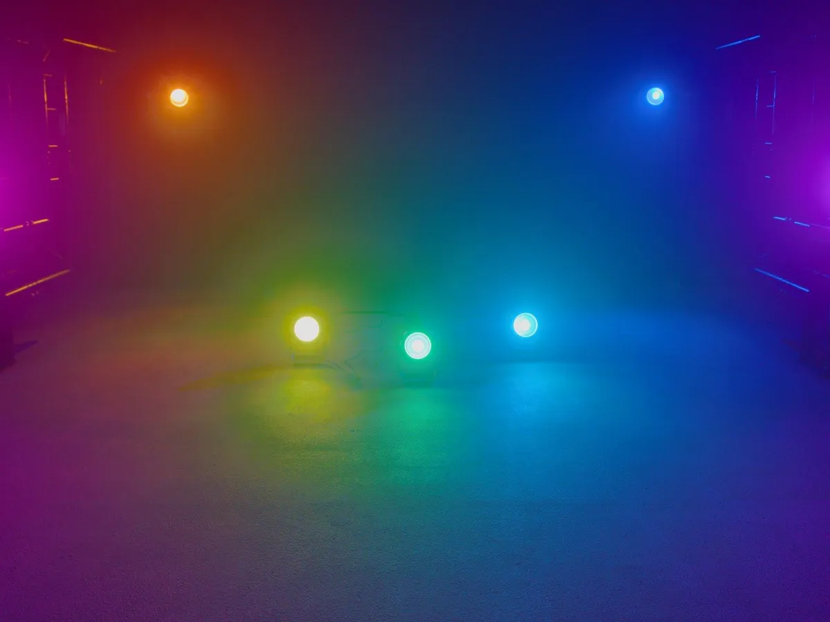 Inbyggda färgbytesprogram, steglös färgblandning via DMX, dimmer och stroboskopeffekt