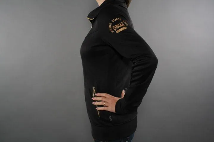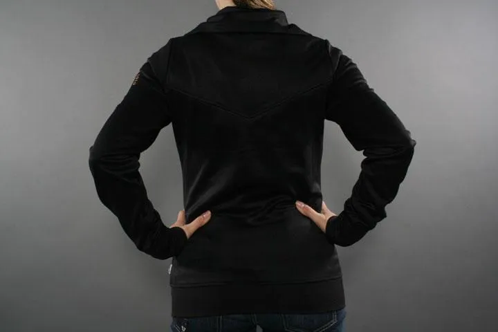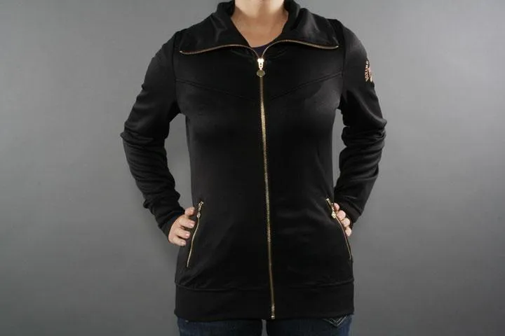 Riktigt snygg ladies zip-up med dragkedja i guld. Litet guldtryck på ena ärmen. 80% bomull, 20% polyester. Dam, svart, medium.