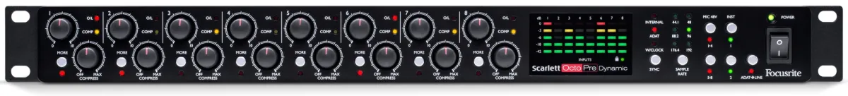 Scarlett OctoPre features eight 2nd Generation Scarlett mic inputs - balanced line inputs too - all running through Focusrite precision 24-bit conversion at up to 192 kHz resolution with 109dB dynamic range.