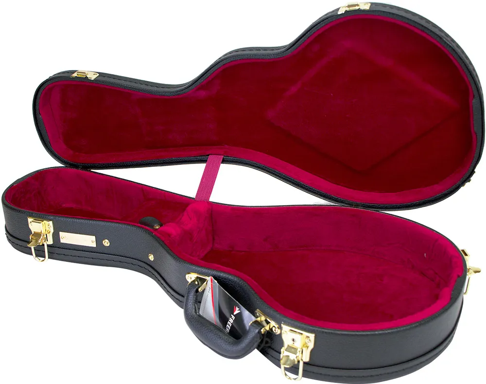 Högkvalitativt Woodcase som erbjuder optimalt skydd för ditt instrument kombinerat med ett klassiskt utseende. Yttermaterial i tålig svart tolex med fin struktur och beslag i guldfärgad kraftig metall. Caset kan låsas med nyckel. Metallfötter sitter välplacerat på casets undersida. Insidan är stoppad och klädd med mörkröd sammet. Extra stoppning finns i locket vid kropp och hals. Tillbehörsfacket är av solid träkonstruktion och skruvat i caset för bästa stabilitet. Det bekväma handtaget kommer glädja dig varje gång du bär ditt instrument i denna case. Innermått 71x28x10cm