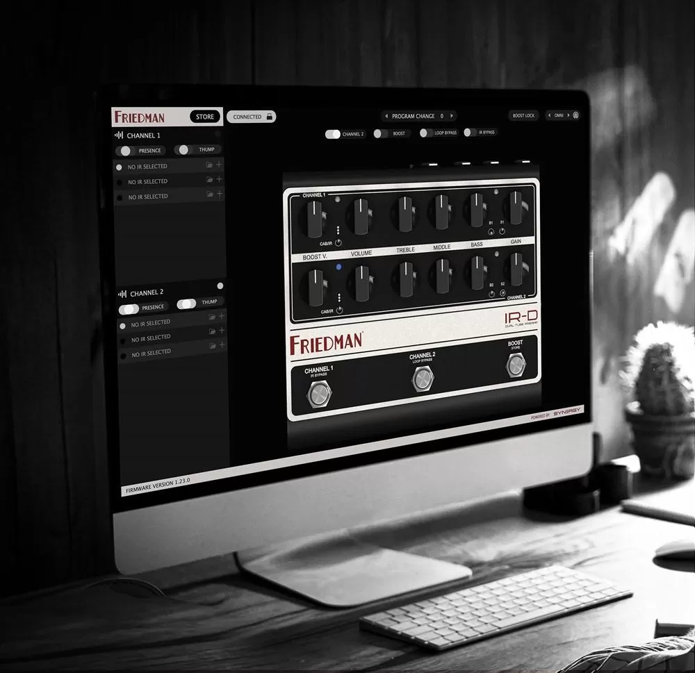 IR-D ger dig häpnadsväckande tonkontroll, men den medföljande programvaran Friedman Editor tar det till en ny nivå. Med den kan du justera varje kanals effektförstärkarsimulering via Thump- och Presence-kontrollerna, ladda dina favorit-IR, aktivera Boost Lock-funktionen, välja loop ON/OFF och spara allt till 128 MIDI-förinställningar.