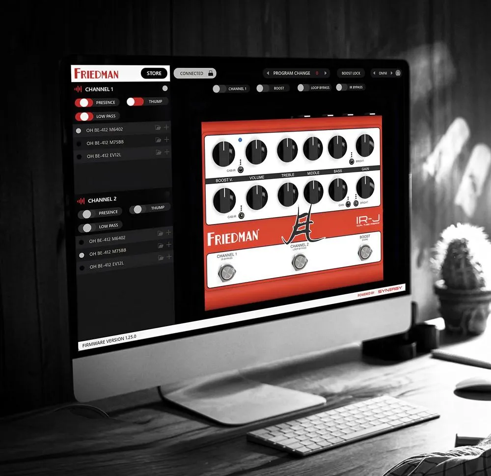 IR-J ger dig häpnadsväckande tonkontroll, men den medföljande Friedman Editor-programvaran tar det till en ny nivå. Med den kan du justera varje kanals effektförstärkarsimulering via kontrollerna Thump, Presence och Low-Pass Filter, ladda dina favorit-IRs, aktivera Boost Lock-funktionen, välja loop ON/OFF och spara allt i 128 MIDI-presets.
