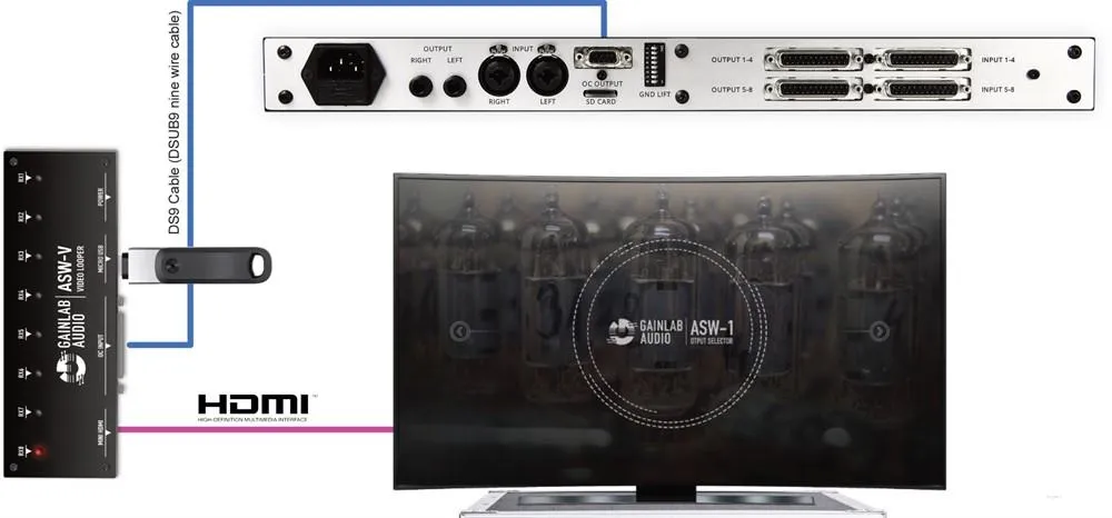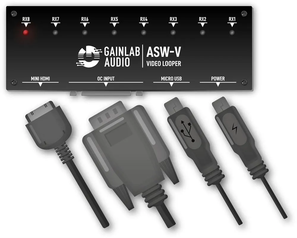 Gainlab ASW-V är en hjälpenhet för ASW-1 Audio Loop Selector, som möjliggör uppspelning av videofiler beroende på vilken enhetsplats som valts på ASW-1. Kopiera bara videofilerna som motsvarar platserna till USB-enheten som medföljer ASW-V, och så snart du väljer en plats på ASW-1 börjar motsvarande video att spelas upp. Det krävs ingen separat programvara för hantering och innehållet på lagringsenheten kan enkelt replikeras. Den spelar upp videofiler från valfri USB-lagringsenhet och matar ut dem via HDMI i FullHD-upplösning.