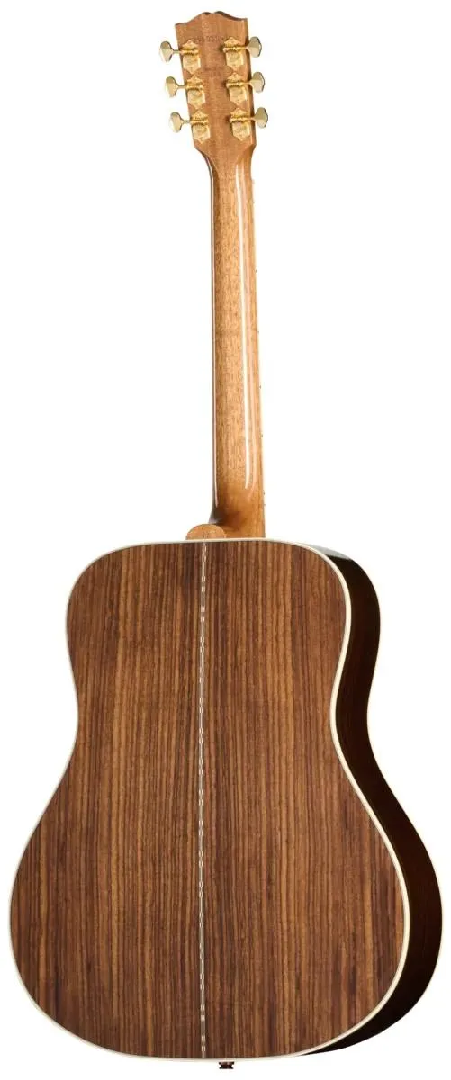 Det bundna huvudet har rosenträfaner med Gibson-logotyp och Crown inlagda i pärlemor. Sadelmaterialet är ben och gitarren är utrustad med högkvalitativa Grover® Open-Back stämskruvar i guld. Stallet är ebenholts med bensadel och TUSQ® stallpinnar, dekorerat med pilformade inlägg i pärlemor. Den termiskt åldrade Sitkagran-toppen skyddas av ett Custom Line plektrumskydd i tortoise-stil och har en bred abalone-rossett.