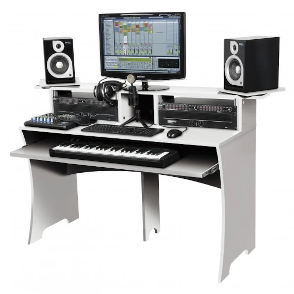 Den nya arbetskonsolen för hemma- och studioprojekt från det kreativa Glorious-huset har en tydlig design och finns i tre färgvarianter. Glorious-tillverkarna har arbetat hårt för att skapa en arbetsstation som passar lika bra för producenter, studiotekniker som hobbymusiker. Konstruktionen är extremt robust, monteringen går snabbt och den eleganta möbeln erbjuder plats för viktiga föremål från producentens vardag. Det kan vara förstärkare, studiomixer, mikrofon, keyboard, hörlurar eller annan utrustning: Allt kan förvaras på ett ergonomiskt sätt och är alltid inom räckhåll. Den utdragbara lådan är mycket praktisk för att placera ett masterkeyboard ovanpå. När det inte längre behövs kan lådan enkelt och bekvämt skjutas tillbaka, vilket underlättar ett bekvämt arbetsflöde för PC-keyboard och utrustning. Genomtänkta hålrum för kabeldragning är en självklarhet och det finns också tillräckligt med utrymme för DVD-skivor, böcker och tillbehör. På den upphöjda andra nivån är det möjligt att placera stora TFT-skärmar på ett smidigt sätt. På vänster och höger sida av bildskärmsutrymmet finns två särskilda fack för högtalare till studiomonitorer. Den främsta attraktionen är att dessa brickor är vridbara. På så sätt är det möjligt att hitta den perfekta positionen för högtalarna. Härlig arbetsbänk: Lätt att montera, bekvämt att förvara, välproducerad.