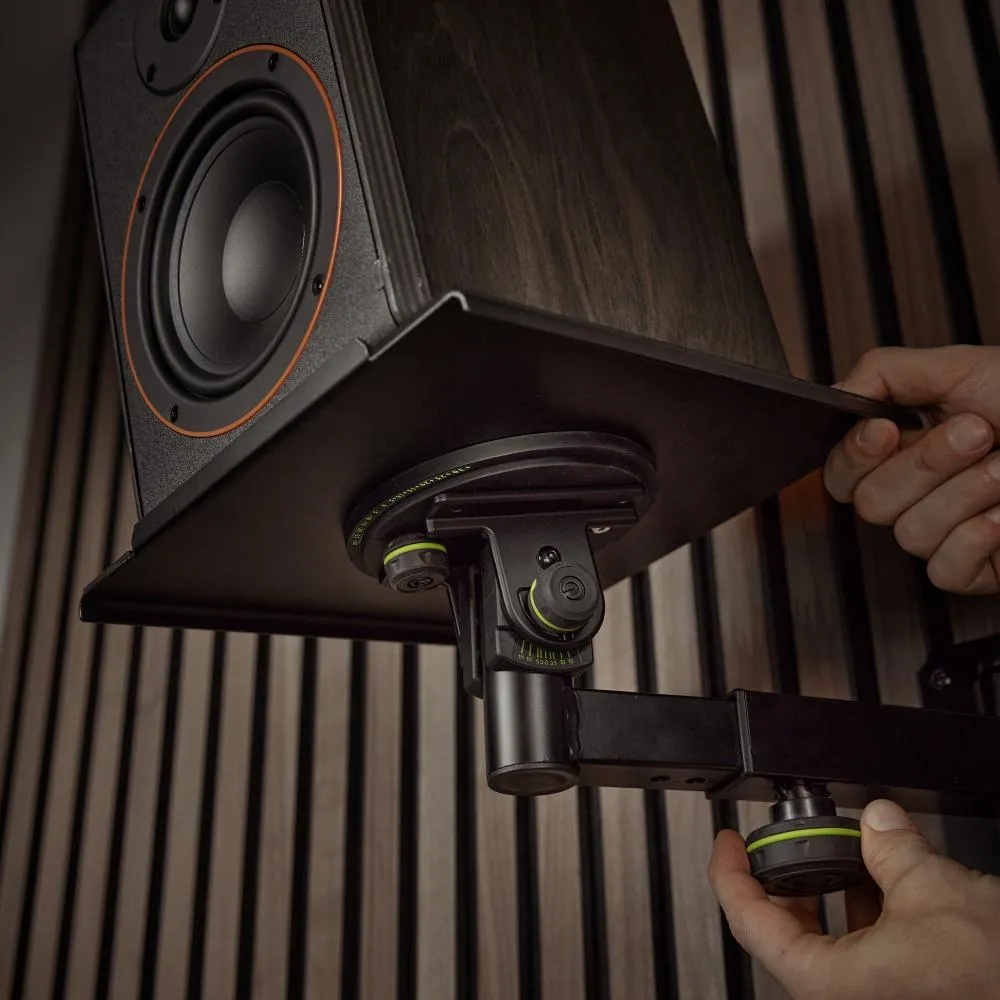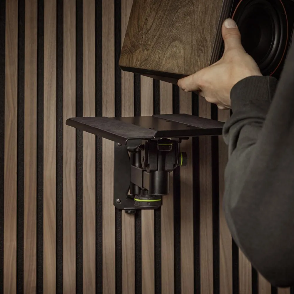 Gravity SP WM 1 B är den ultimata lösningen på detta problem. Med detta robusta och stabila väggfäste kan du enkelt placera dina bildskärmar på väggen. SP WM 1 B har en 5 mm tjock väggplatta för att säkert fästa konstruktionen på väggen, med en imponerande maximal lastkapacitet på 50 kg, som kan säkras ytterligare med det integrerade säkerhetsöglan. Som förväntat av Gravity låses allt säkert på plats med hållbara, lättgreppade knoppar. Den smarta designen möjliggör fem justerbara positioner av stödarmen och en horisontell rotation på 180°, vilket tillgodoser de specifika rumskraven i ditt rum. Detta säkerställer en enkel process för att placera dina monitorer korrekt, vilket skapar en ren lyssningstriangel med en sweet spot.