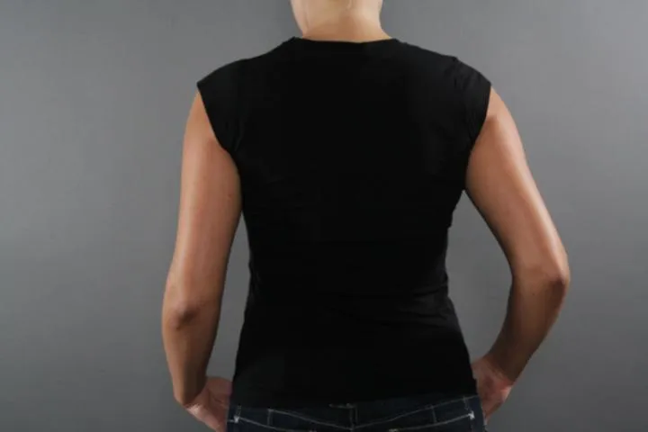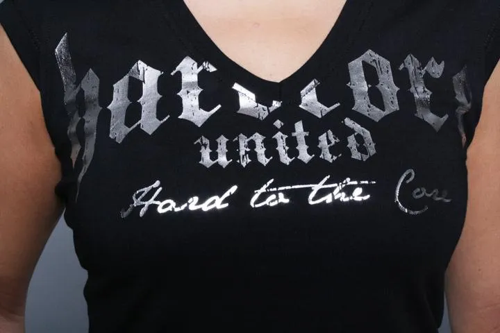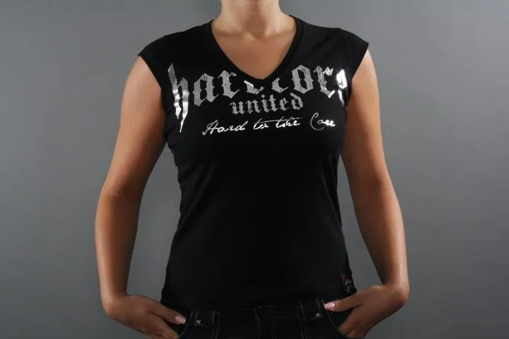 Kortärmad t-shirt med djup v-neck. Hardcore logo i silver tryckt på bröstet. 100% bomull. Dam, svart, medium.