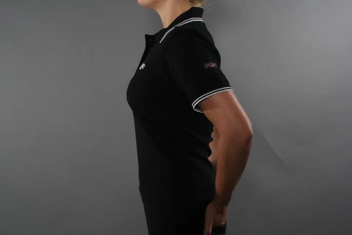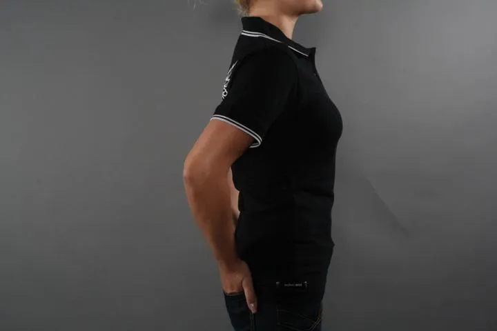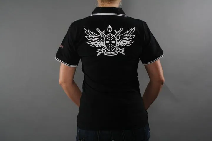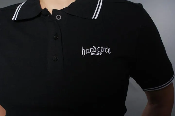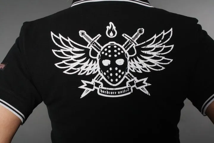 Kortärmad polo med brodyr på bröstet och stort tryck på ryggen. Hardcore United med 2 dödskallar i metall på höger midja. 95% bomull, 5% spandex. Dam, svart, XL.