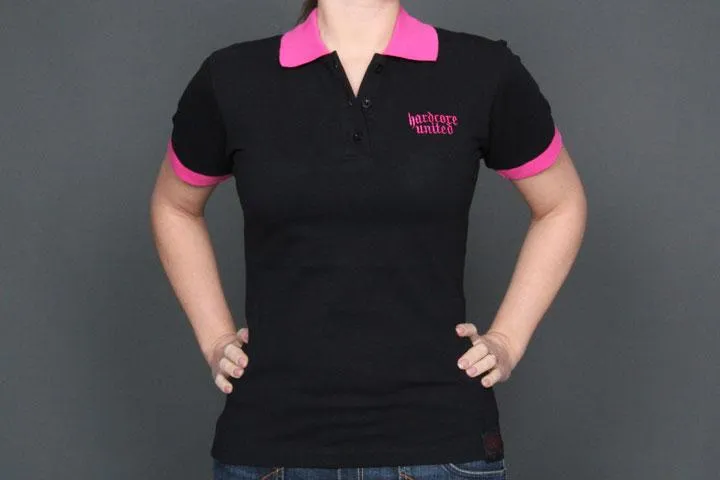 Ladies polo i svart/rosa med liten broderad logo på bröstet. 95% bomull, 5% elasthan. Stort tryck på ryggen. Dam, svart, medium.