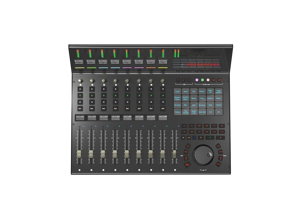 Ikon V1-M; USB DAW-kontroller; 9 beröringskänsliga motoriserade faders med 12-bitars upplösning; 7" OLED-pekskärm med 24 programmerbara paneler och 5 lager för totalt 120 kontrollerbara funktioner; upp till 3 DAWs kan styras samtidigt; nivåmätare, 2" TFT-skärm för parametervärden och 1,14" TFT-skärm för ytterligare information för varje kanal; på varje kanalkodare och belysta knappar för inspelningsarm, solo-, mute- och kanalval och belysta knappar för DAW-kontroll med MacOS 10.15 eller högre , Audition, Ableton Live, Bitwig, Cakewalk, Cubase/Nuendo, Digital Performer, FL Studio, Mixbus 32C, Pro Tools, Logic Pro, Luna, Reaper, Reason, Samplitude, Studio One och Tracktion Waveform stöder Mackie Control Universal och HUI-protokoll ; USB-C-portar; USB-C-kabel och extern strömförsörjning (12V DC / 2,5A)