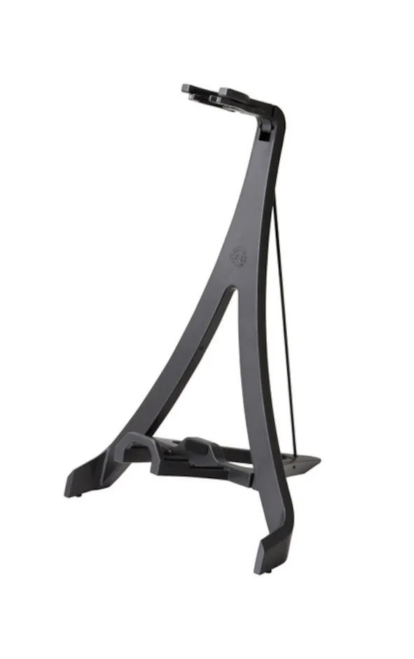 Unikt gitarrstativ i hög A-ramdesign för akustiska eller elektriska gitarrer. Den hållbara och lätta plastkonstruktionen i ett stycke står för funktionalitet och stabilitet. Gitarrstativet fälls platt för enkel transport. Stödarmarna med mjuka filtkuddar skyddar gitarrens botten från repor och skador. Stativet är lämpligt för alla typer av gitarrlack, inklusive nitrolack. Det funktionella halslåset ger ett säkert grepp när gitarren placeras på stativet.