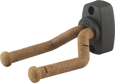Svart väggfäste för gitarr med rörlig bygel och upphängsklyka i korkimitation.