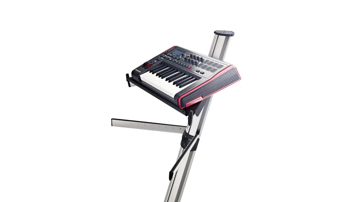 The stable aluminum tray creates new uses for the Spider Pro keyboard stand. By placing the tray on the upper support arms of the Spider Pro now even smaller synthesizers, controllers, drum machines etc. can be used. The integrated handle can also be used for cable management. The equipment stop with an integrated edge protective strip and the anti-slip rubber end caps provide extra hold. And to top it off the tray only weighs 1 kg.