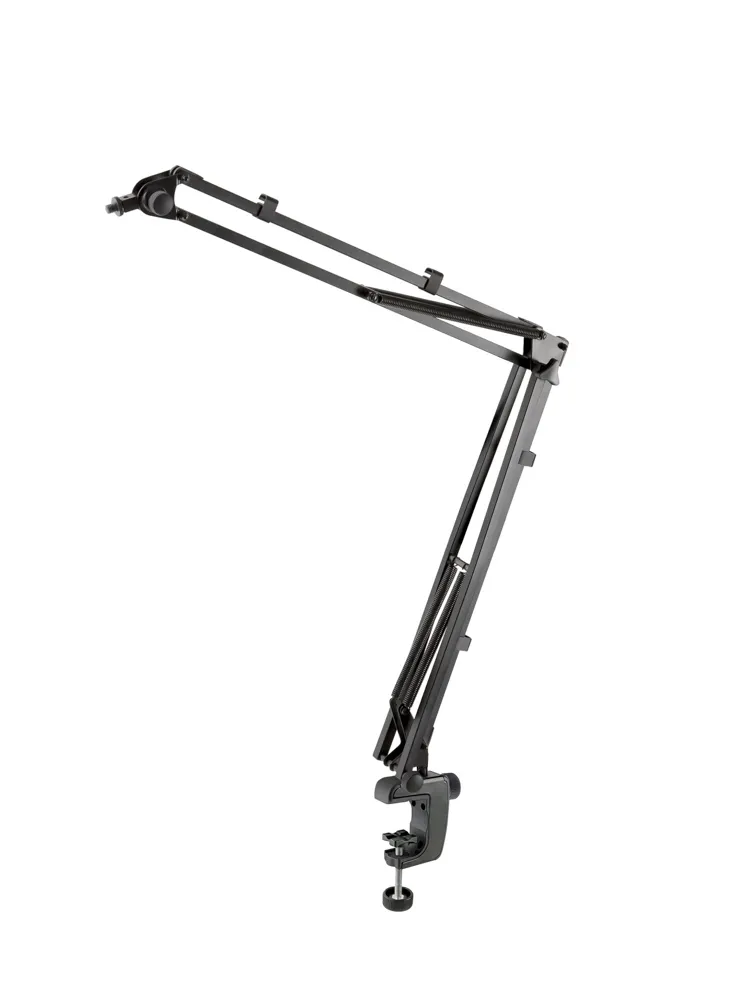 Flexibel skrivbordsmikrofonarm med 3/8" eller 5/8" gängad anslutning för inspelningsstudior och multimediaarbetsstationer. Mikrofoner, surfplattor eller smartphones med en totalvikt på upp till 0,8 kg kan enkelt och bekvämt justeras och placeras. Mikrofonbordsarmen levereras utan kabel och kan därför utrustas individuellt. Fyra användbara kabelklämmor ingår redan i leveransen. Med ett spännområde från 20 till 51 mm erbjuder klämman ett brett utbud av monteringsalternativ. Den robusta metallramen med högkvalitativa plastinsatser och halkfritt stöd säkerställer säker och kraftfull fastspänning. Tack vare de speciellt formade spännytorna kan klämman användas på släta ytor såväl som på runda rör. Som tillval kan mikrofonarmen även fixeras med den extra tillgängliga bordflänsen 23855.