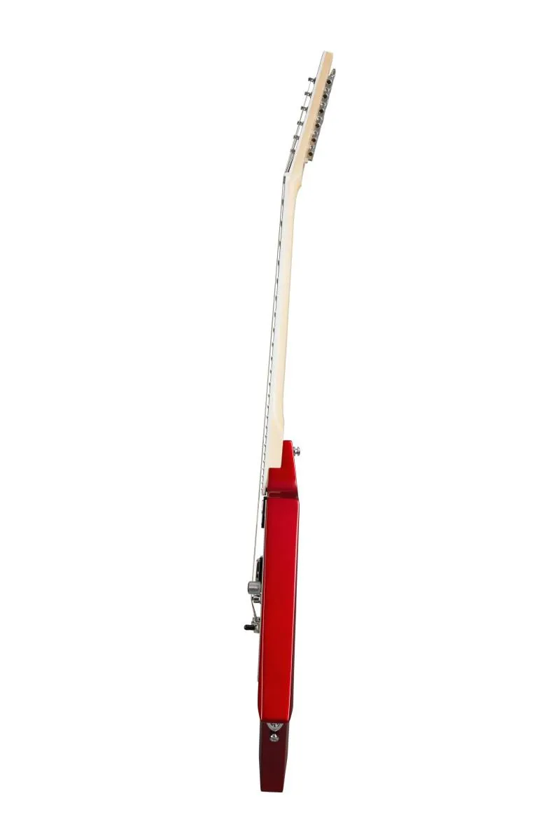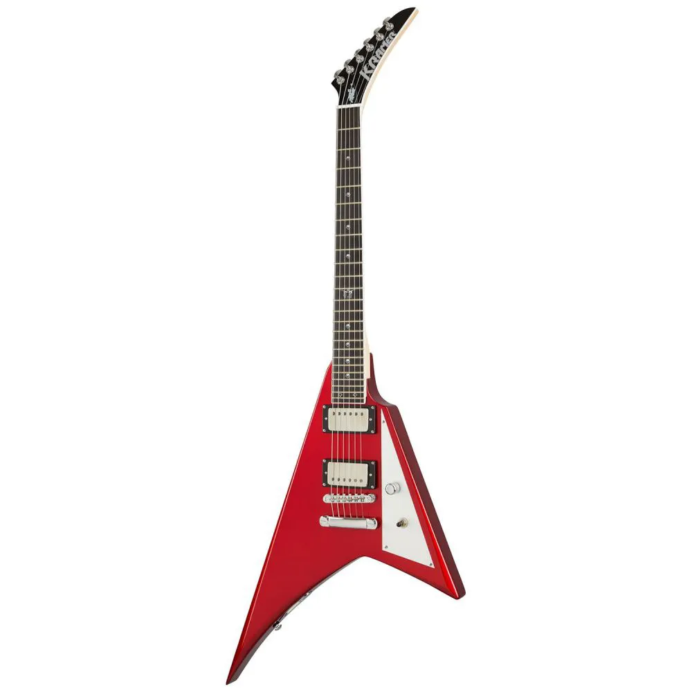 The Kramer Charlie Parra Vanguard is the second Kramer signature model from the Peruvian metal master. Featuring a mahogany body, 3-piece satin-finished maple neck, bound ebony fretboard with 24 jumbo frets, dot inlays with 12th fret Day of the Dead owl, a single chrome knurled master volume control, and 3-way pickup selector switch mounted on a satin aluminum pickguard, EMG™ 57 and 66 pickups with chrome covers, a recessed output jack on the upper horn, and a LockTone™ Tune-O-Matic™ bridge and Stop Bar tailpiece. Charlie Parra's signature is engraved on the truss rod cover, and his signature Vanguard is finished in Candy Apple Red Gloss. Kramer premium gig bag included.