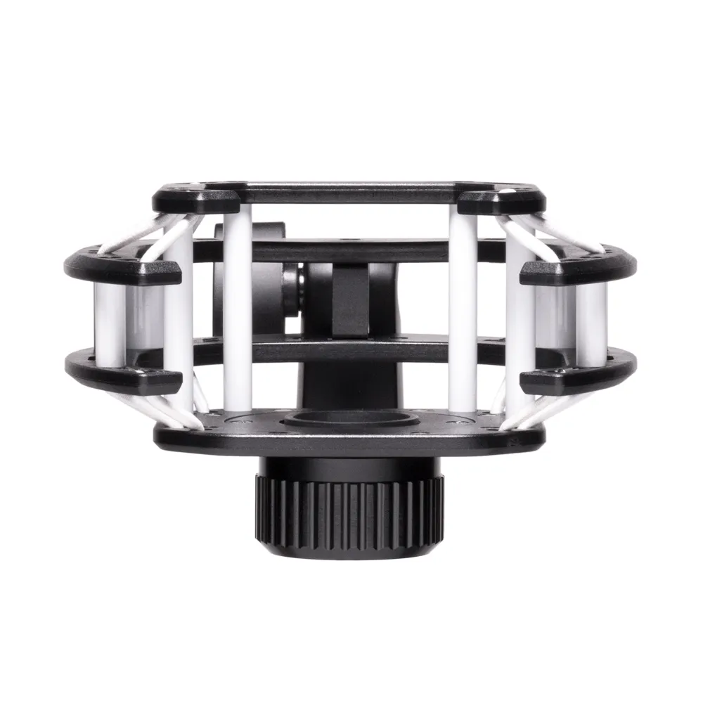 Stötfäste för studiomikrofoner. Dämpar buller, stötar och vibrationer som överförs genom mikrofonstativ, bommar och fästen. Snabbverkande gängförslutning möjliggör snabb och enkel installation. Kompatibel med 3/8" och 5/8" gängor.