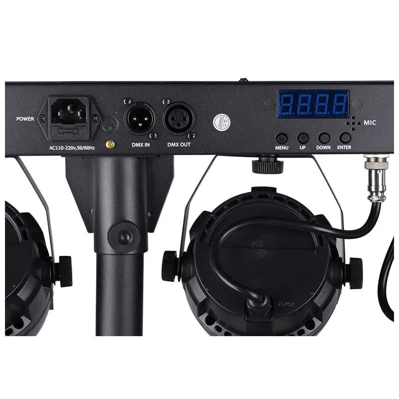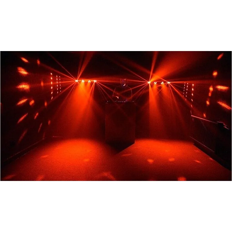 Enheten kan styras via DMX-kontroller, fjärrkontroll eller automatiskt/ljudläge (inbyggd känslig mikrofon). Detta är en idealisk bärbar uppsättning för en mobil DJ eller musikband. Den kan med framgång användas i små lokaler, skolor, förskolor, pubar etc.