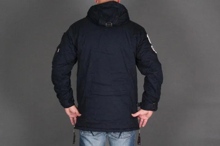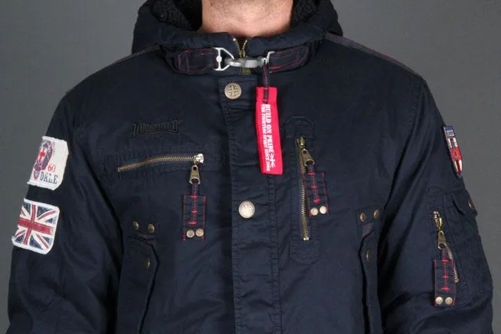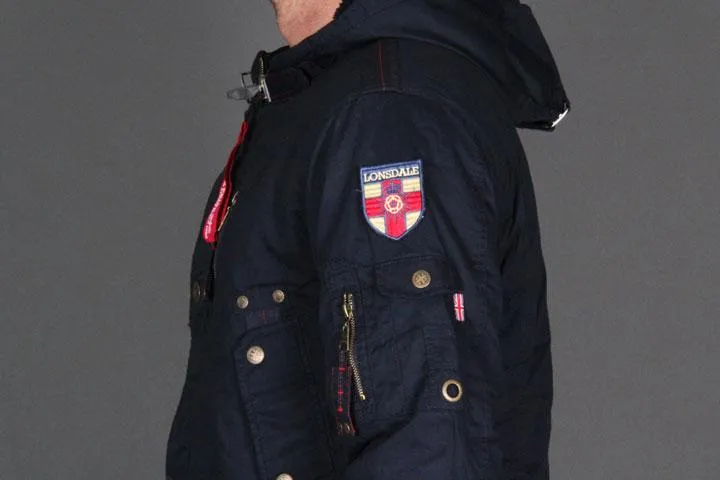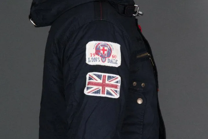 Vinterjacka för män, Parka-look med badges, Många detaljer och flera fickor, 4 innerfickor, Varm huva, Avtagbart emblem på vänster axel, Utsidan: 100% bomull, Foder och vaddering: 100% polyester, navy, Small.