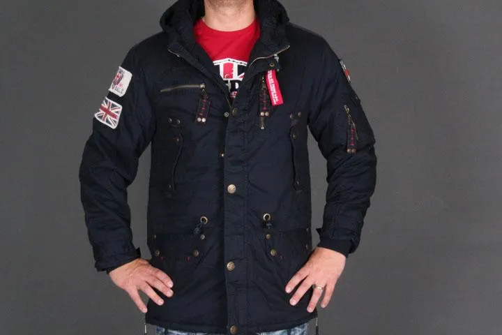 Vinterjacka för män, Parka-look med badges, Många detaljer och flera fickor, 4 innerfickor, Varm huva, Avtagbart emblem på vänster axel, Utsidan: 100% bomull, Foder och vaddering: 100% polyester, navy, XXL.