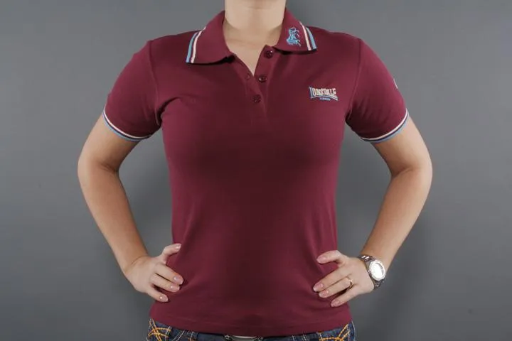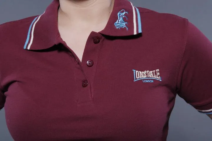 Polo med broderad Lonsdale logo på vänster bröst. Lejon broderat på kragen. 210 g/m2, 95% bomull, 5% spandex pique. Dam, Oxblood, XL.